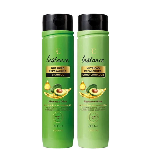 Kit com shampoo e condicionador para cabelos secos e quebradiços. Kit Eudora Instance Nutrição Reparadora Abacate e Oliva Duo promove limpeza suave, sela e hidrata os fios.