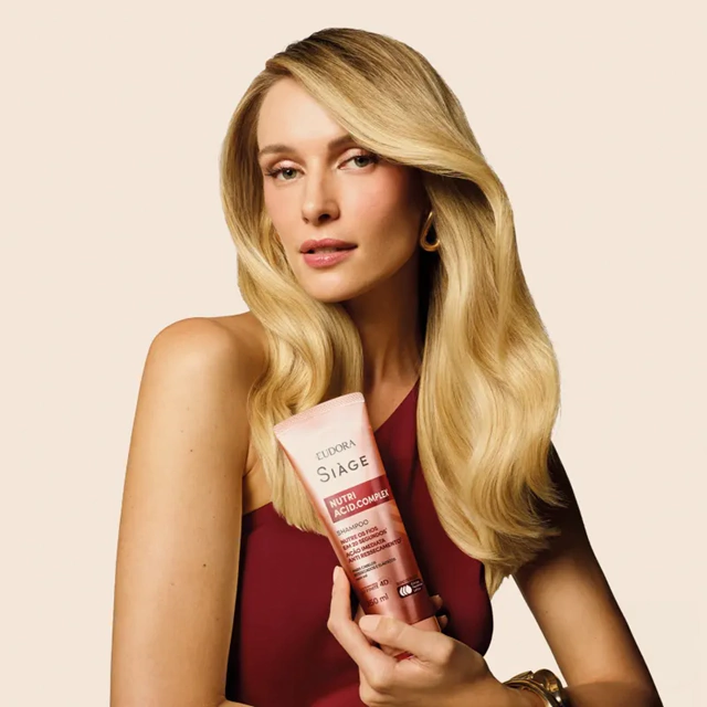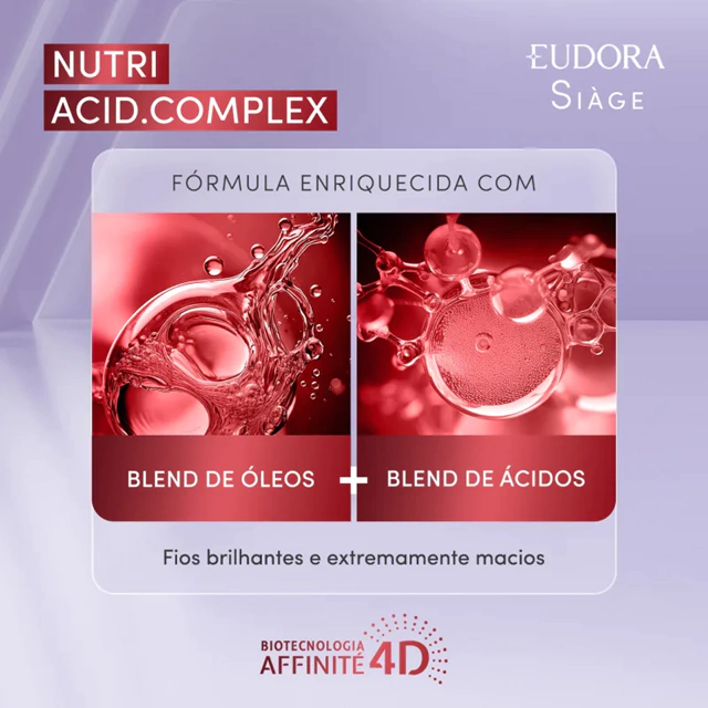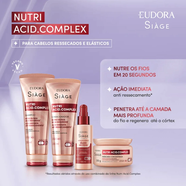 Siàge Nutri Acid.Complex¹ revolucionou a nutrição capilar através da fusão de um poderoso blend de ácidos com óleos nutritivos, em uma fórmula capaz de regenerar todas as camadas do fio, da cutícula até o córtex. Sua fórmula repõe nutrientes essenciais que previnem o ressecamento e garante fios brilhantes, extremamente macios e mais resistentes. Cabelos completamente nutridos em 20 segundos¹.