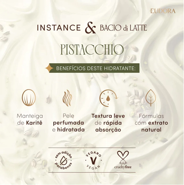 Eudora Instance Pistacchio combina a cremosidade do Pistacchio com o delicioso acorde Bacio di Latte em uma fragrância oriental irresistível e surpreendente.