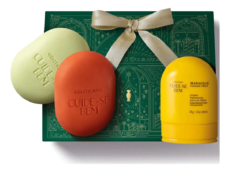 O Kit Presente Natal Cuide-se Bem Feira traz três itens, um creme de mãos e dois sabonetes que tornam a rotina mais delicada e refrescante. Para deixar tudo mais especial, o kit vem pronto para presentear em uma caixa que transmite cuidado em cada detalhe: