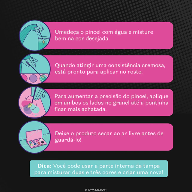 Em edição limitada, é uma ótima opção de maquiagem infantil em um presente para criança super estiloso! Pegue carona nos poderes de camuflagem da Spider-Gwen ou na energia bioluminescente do Spider-Man do Brooklyn e crie a maquiagem ideal de heroína desse mundo e de todos os outros.