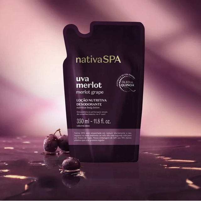 A Loção Nutritiva Desodorante Nativa Spa Uva Merlot te convida a degustar o prazer da sua própria companhia com a potência de um tratamento que desacelera os principais sinais do tempo desde o primeiro uso¹, recuperando o tempo que sempre foi seu.