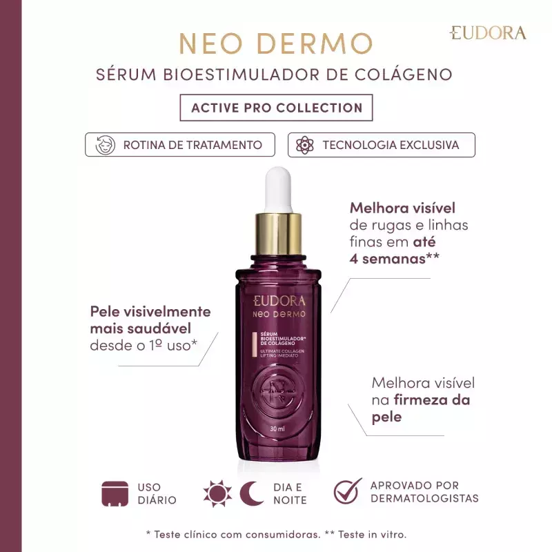 O Sérum Bioestimulador de Colágeno Neo Dermo possui fórmula inteligente que aumenta em 36% a produção de colágeno em até 4 dias* de uso. Pele visivelmente saudável desde o 1º uso com efeito lifting imediato.