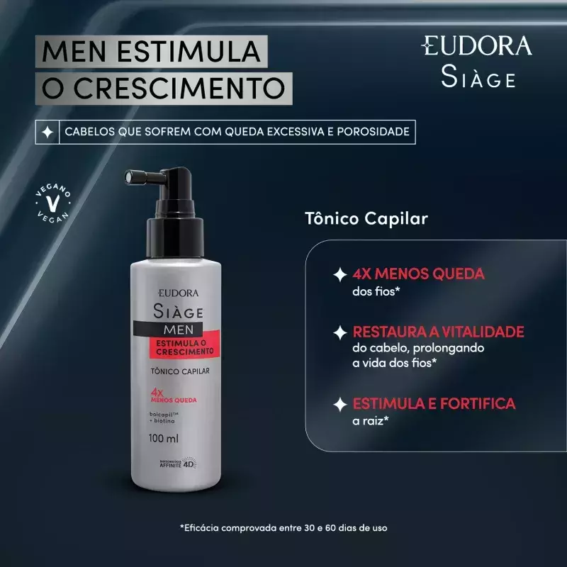 A fórmula deste tônico capilar masculino para queda de cabelo de Siàge Men com Baicapil e Biotina entrega um tratamento eficaz para fios mais fortes e resistentes. Além de estimular o crescimento de novos fios em apenas 30 dias de uso contínuo.